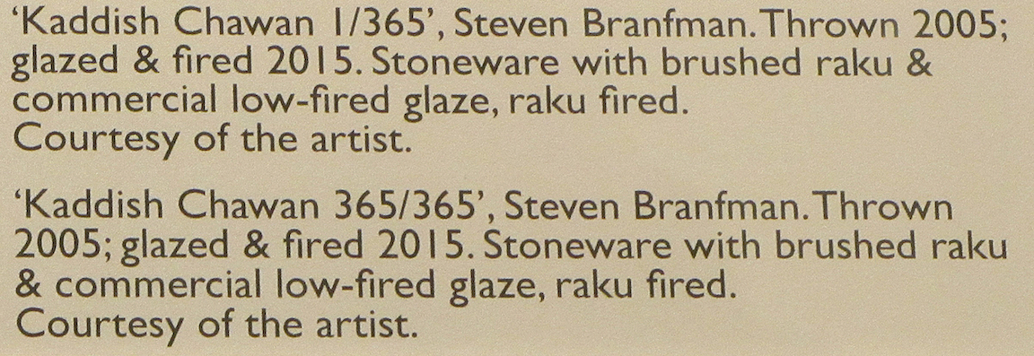 [Figure 81: Steven Branfman, installation photo with Kaddish Chawan 235/365, May 19, Jared’s Birthday in foreground. Thrown 2005; glazed and fired 2015. Wheel-thrown stoneware with brushed raku and commercial low-fire glaze, raku fired, 7.6 × 10.1 cm. Photo by Nicki Pardo Photography