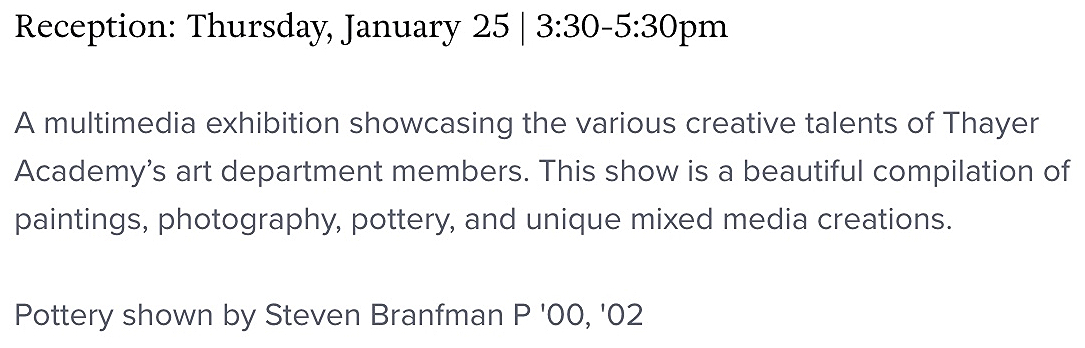 - January 21: Guest Critique, Wellesley (MA) High School Intensive Ceramics Program