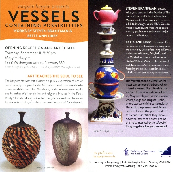 - August 1-December 31: Vessels; Containing Possibilities. Works by Steven Branfman & Betty Ann Libby. Mayyim Hayyim Gallery 1838 Washington St Newton MA. Opening Reception and Artist Talk Thursday September 11 5:30